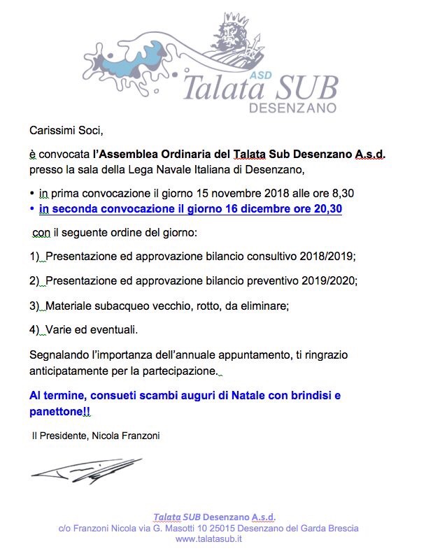 Assemblea Ordinaria del Talata Sub Desenzano A.s.d. Pubblicato da talatasub516346539 il 1 dicembre 2019 Vi aspettiamo il giorno 16 dicembre alle ore 20.30 presso la Lega Navale Italiana di Desenzano per l’annuale assemblea del Talata, cogliendo l’occasione anche per scambiarci gli auguri di Natale. Mi piace Caricamento...